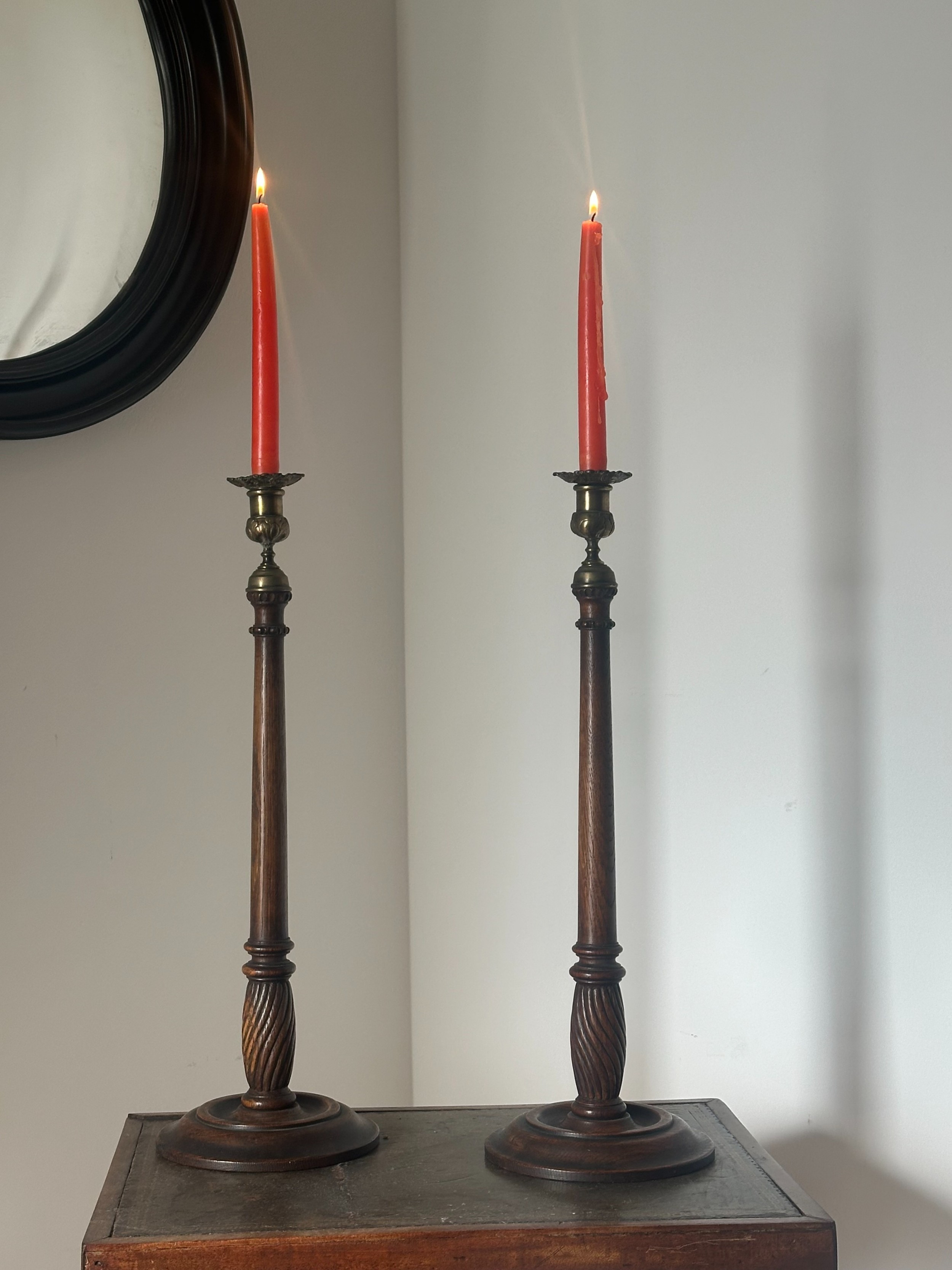 Paar große Kerzenhalter - Eichen Kerzenhalter mit Messingaufsätzen - Dekoratives Paar hoher Eichen Kerzenhalter