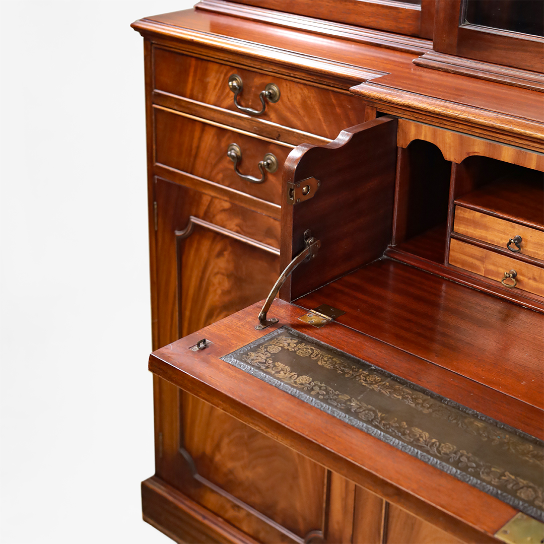 Die obere Vitrine mit verglasten Türen und eleganten Sprossenrahmen bietet stilvollen Platz für Bücher, Porzellan oder Sammlerstücke. Im unteren Teil befinden sich mehrere Schubladen und Schrankfächer, ideal zur Aufbewahrung von Dokumenten, Geschirr oder Wohnaccessoires. Die mittlere Klappe mit feiner Lederauflage verwandelt den Schrank bei Bedarf in einen praktischen Schreibsekretär – eine raffinierte Kombination aus Ästhetik und Funktion.