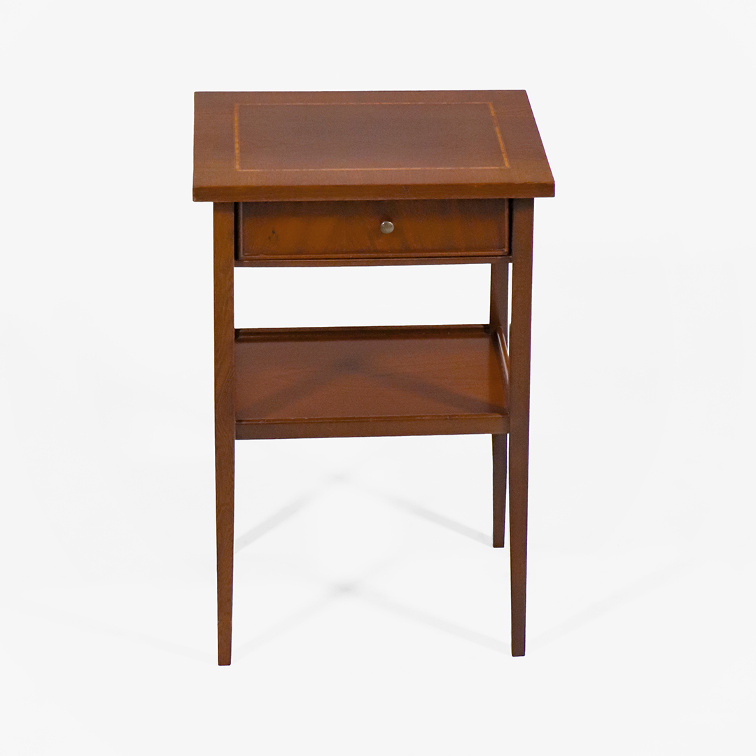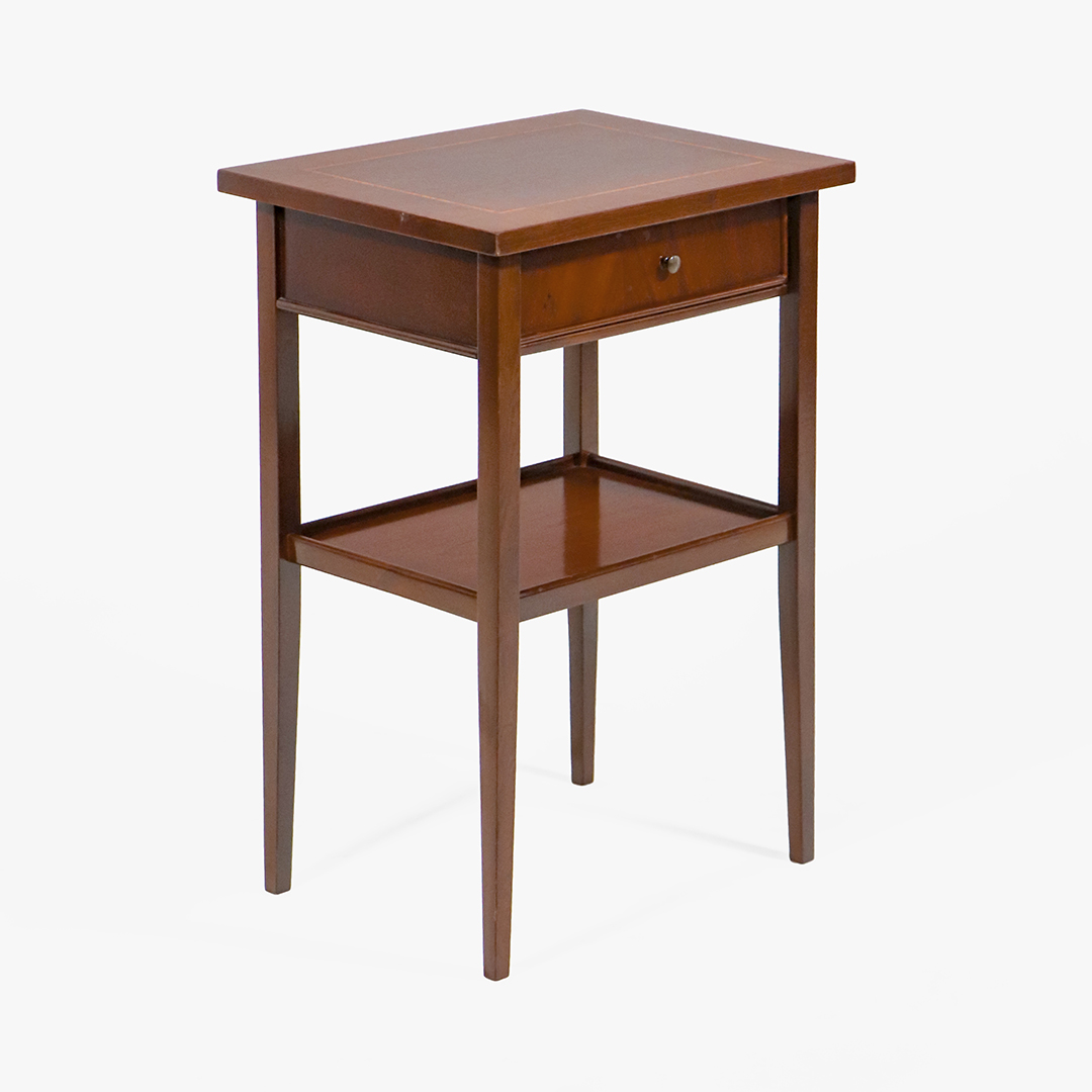 Dieser kleine Mahagoni-Beistelltisch zeigt genau das, was englische Möbelklassiker so charmant macht: klare Linien, ein warmes Holzbild und feine Details. Die Deckplatte ist mit einer umlaufenden Intarsie akzentuiert und verleiht dem Tisch eine elegante, zurückhaltende Note. Die Schublade mit Messingknauf bietet Platz für kleine Dinge, die man gerne griffbereit hat.