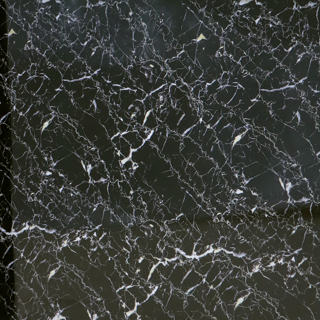 Die Vorderseite dieser Art Deco Minibar ist mit einer dekorativen Platte in schwarzer Marmoroptik gestaltet. Die feine weiße Maserung auf dunklem Hintergrund erzeugt einen hochwertigen Stein-Look und verleiht dem Möbelstück eine besonders luxuriöse Wirkung.