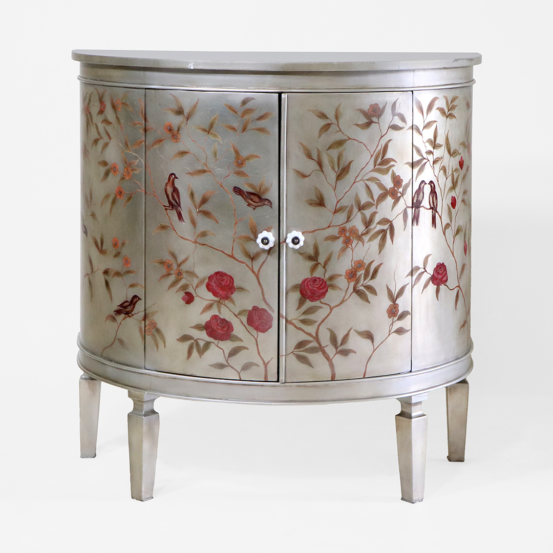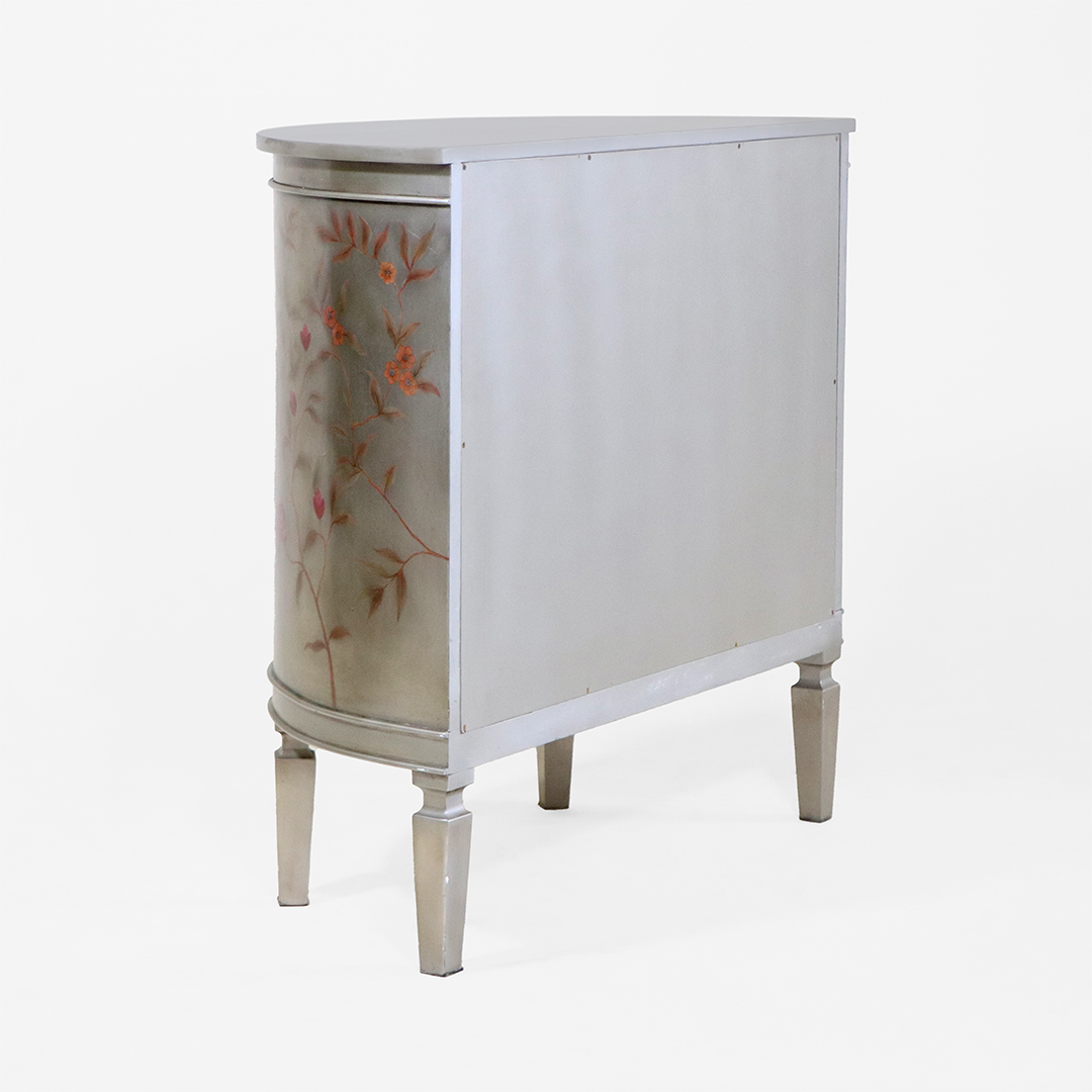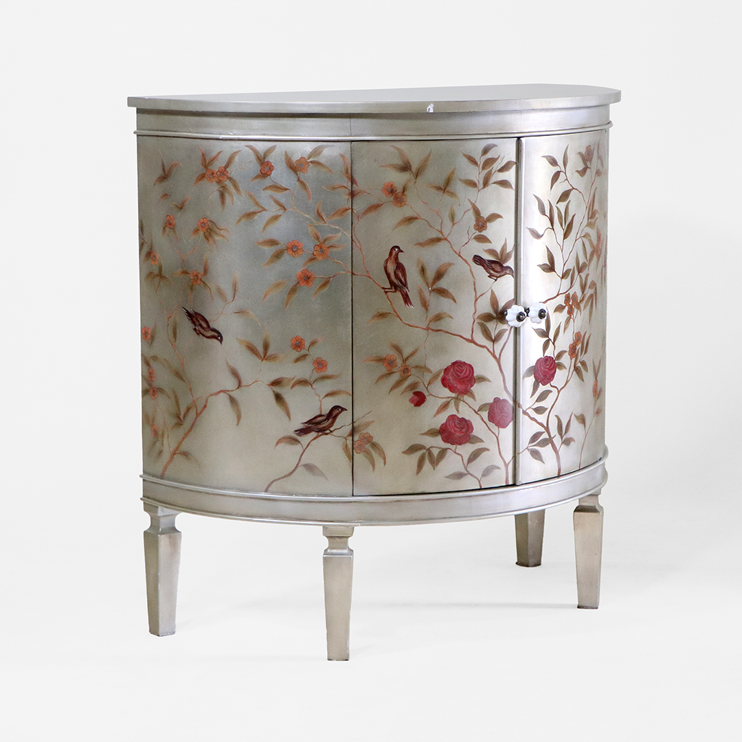 Dieses Bow Front Sideboard besticht durch seine weich geschwungene Front und die edle silberfarbene Oberfläche. Das fein ausgearbeitete Blumenmotiv mit Vögeln verleiht dem Möbel eine dekorative, fast schon künstlerische Ausstrahlung. Durch die kompakte Form eignet sich das Sideboard ideal als stilvoller Akzent im Wohn-, Ess- oder Eingangsbereich.
