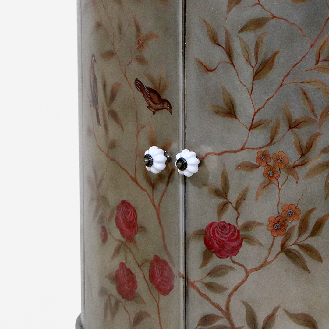 Die silberfarbene Oberfläche bildet die perfekte Bühne für das handgemalte Blumen- und Rankenmotiv, ergänzt durch zarte Vogelillustrationen. Das Dekor wirkt ruhig, ausgewogen und dekorativ, ohne aufdringlich zu sein.
