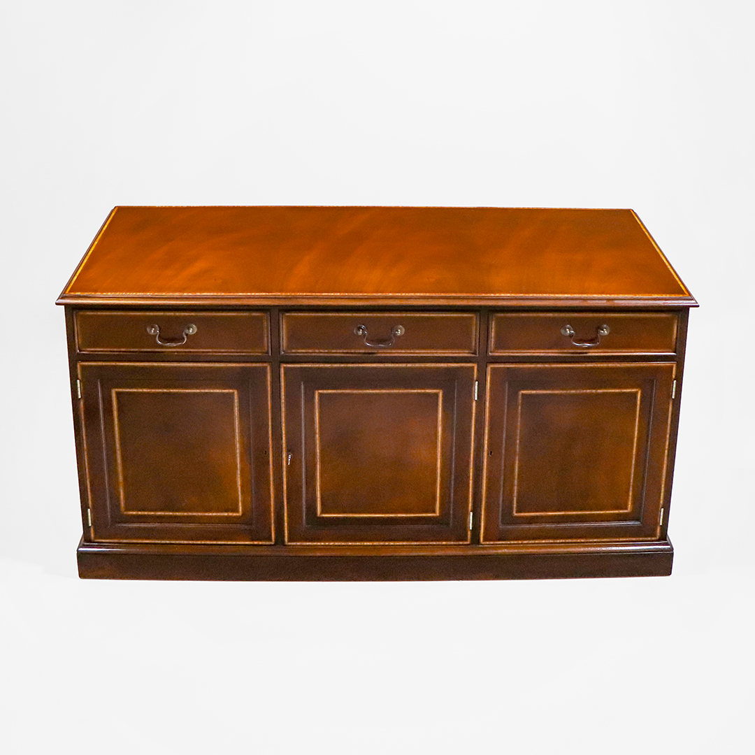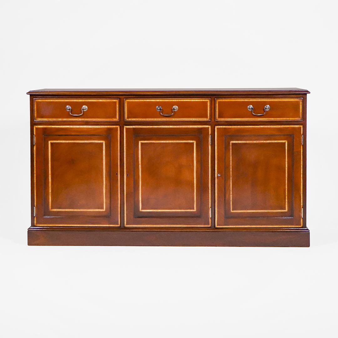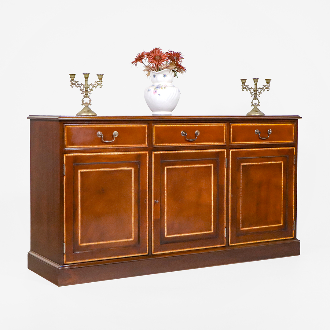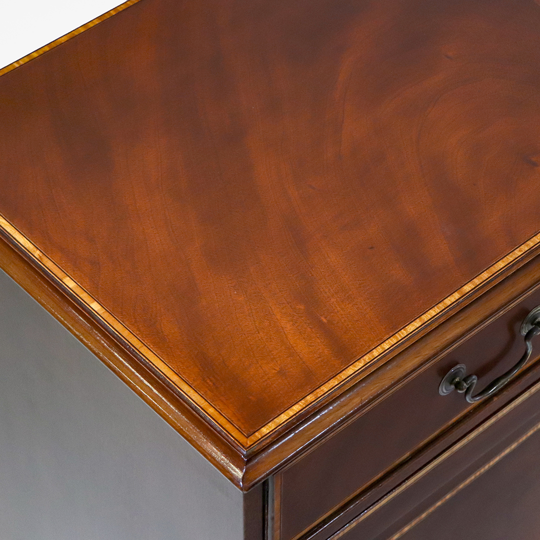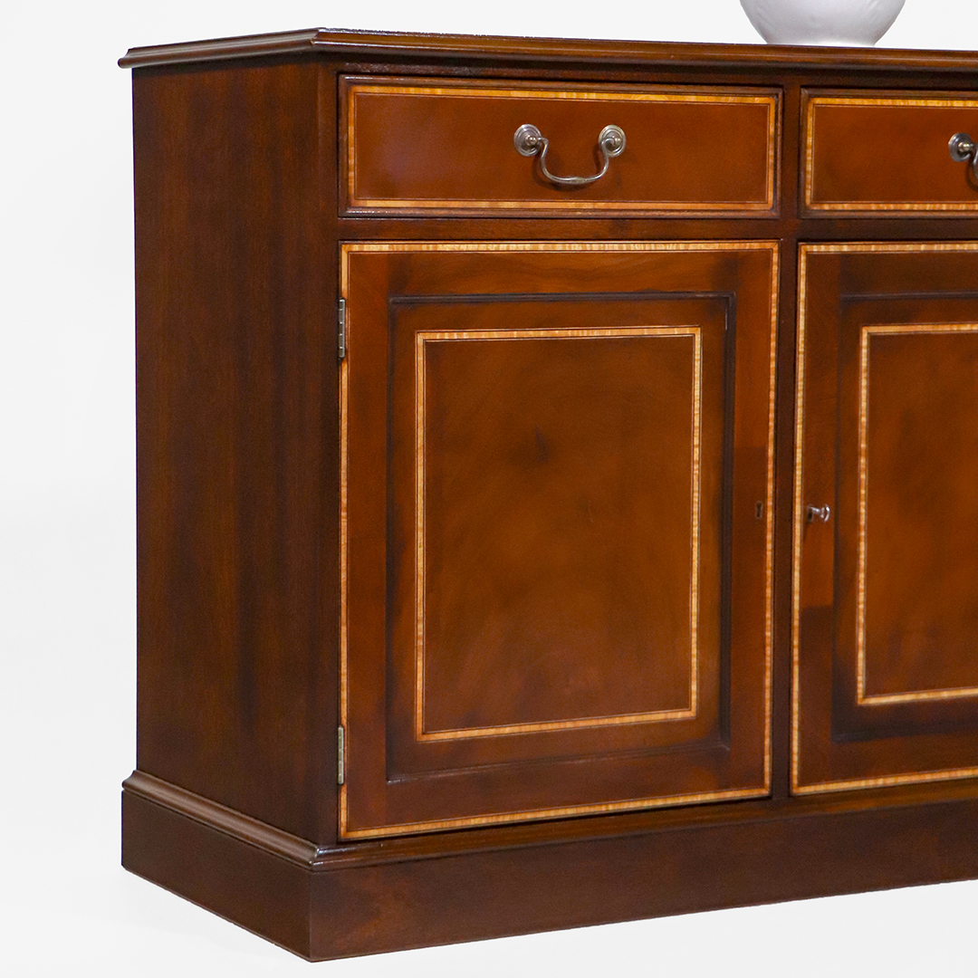 Die Tür- und Schubladenfronten sind mit feinen Intarsien versehen und durch elegantes Satinwood-Crossbanding gerahmt. Diese dekorativen Details setzen einen hellen Kontrast zum dunkleren Mahagoni und unterstreichen die handwerkliche Qualität des Sideboards.