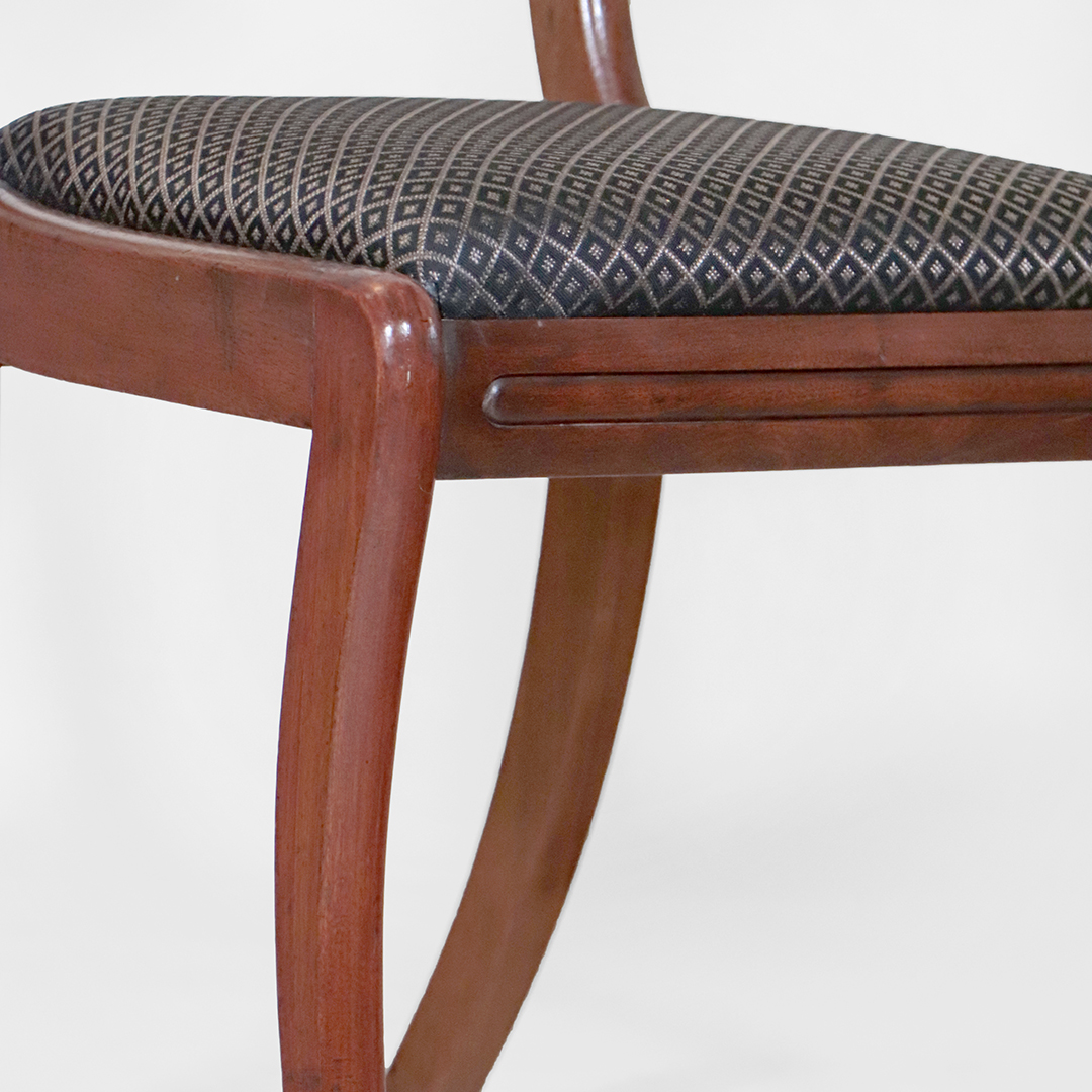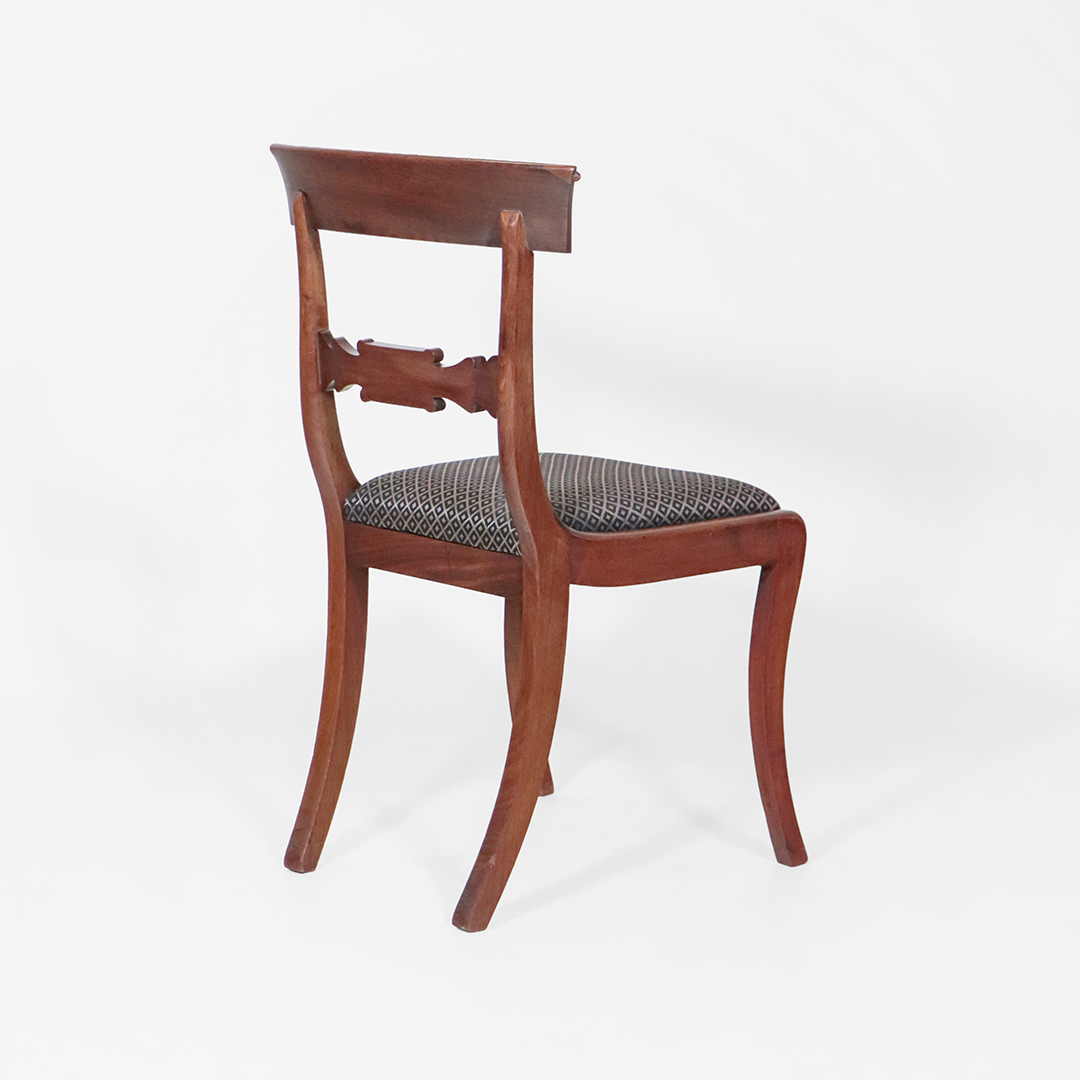 Die charakteristischen Säbelbeine – hinten stark geschwungen und weich in die vorderen Streben übergehend – sorgen für Stabilität und verleihen der Stuhlgruppe ihre typische Regency-Silhouette. Modelle dieser Art, nach Vorbild des englischen Designers William Bradshaw, sind selten, da sie einen hohen Anteil an handwerklicher Arbeit erfordern und kaum maschinell hergestellt werden können. Die Gruppe stammt ursprünglich aus der Zeit zwischen 1800 und 1820.