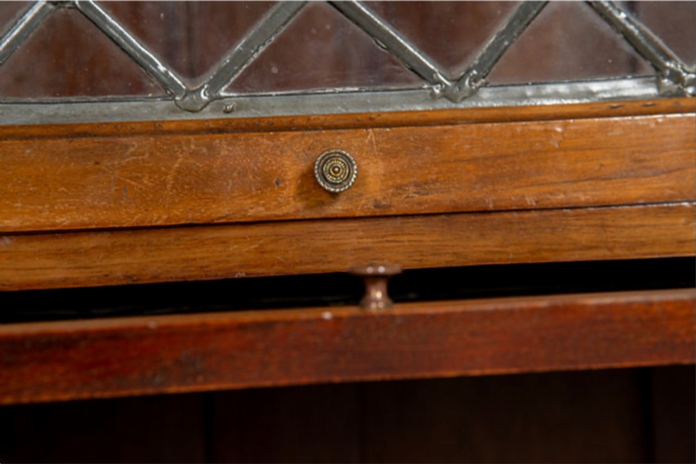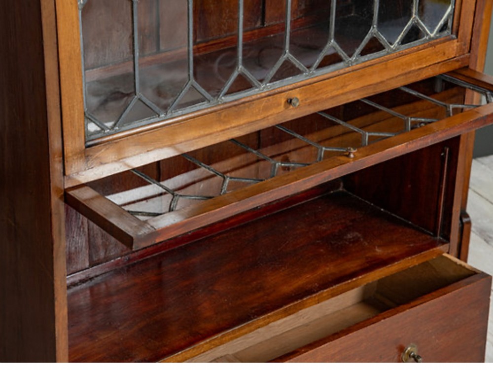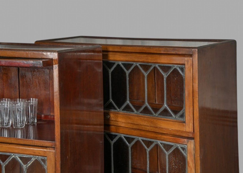 Beide Globe Wernicke antik Schränke stammen aus der Zeit um 1930 und überzeugen durch ihre solide Verarbeitung und den authentischen Charme des gealterten Eichenholzes. Die wunderschöne Holzmaserung verleiht den Schränken Tiefe und Wärme, während die originalen Bleiglasfronten mit geometrischem Muster echten Vintage-Charakter ausstrahlen.