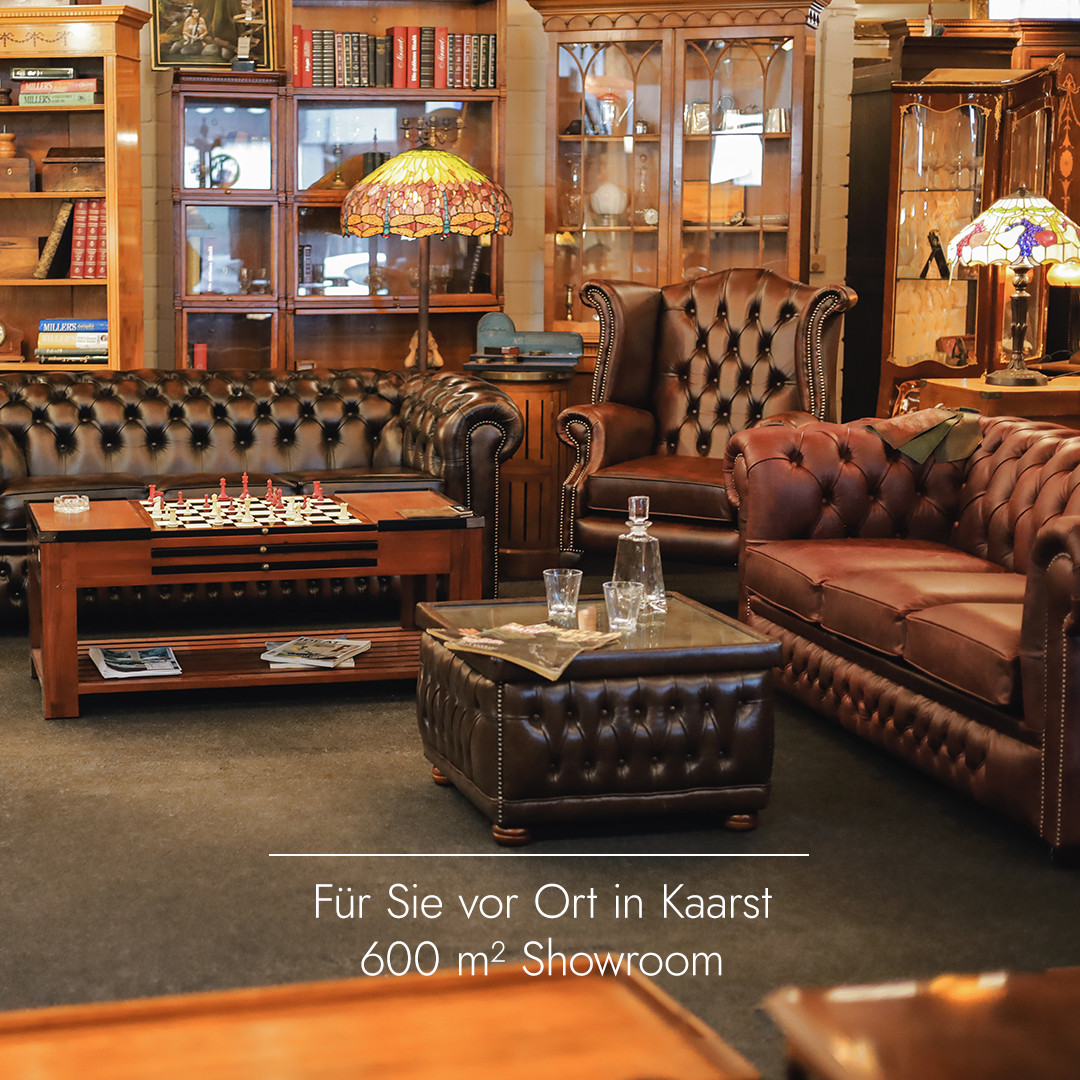 Besuchen Sie uns in unserem großzügigen Showroom in Kaarst bei Düsseldorf – auf über 600 m² Ausstellungsfläche erleben Sie ausgewählte antike Möbel und Chesterfield Klassiker hautnah.