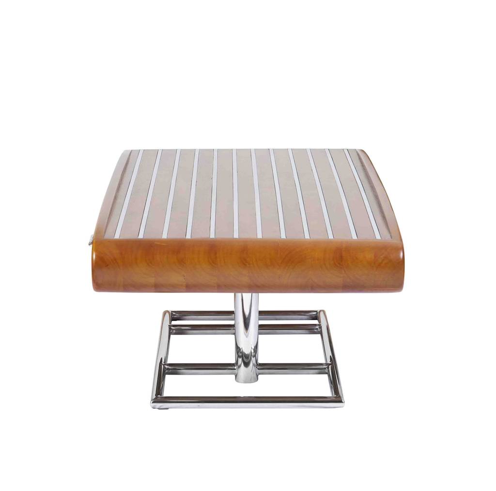 Die Tischplatte aus massivem Holz ist mit dekorativen Edelstahlleisten versehen, die der Oberfläche eine besondere Struktur und Tiefe verleihen. Das stabile Gestell aus Edelstahlrohr sorgt für eine moderne, leichte Optik und unterstreicht den Charakter dieses Couchtisches im Art Deco Style.
