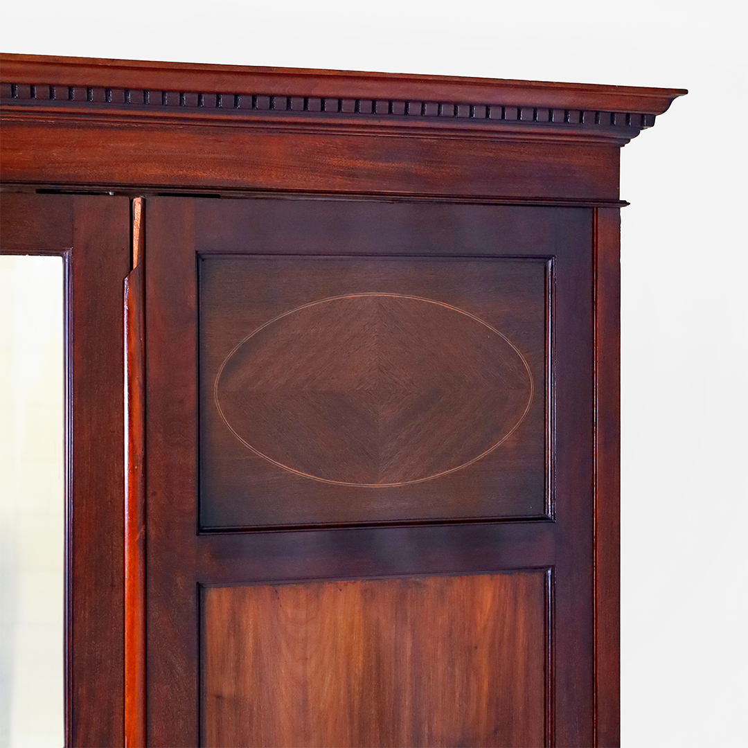 Die Krone zeigt einen umlaufenden Zahnschnittfries sowie eine zentrale, dezent geschnitzte Verzierung – ein typisches Stilelement der Edwardian Epoche. Die Proportionen und das feine Finish machen diesen englischen Schrank zu einem echten Sammlerstück und Blickfang für jedes klassische Interieur.