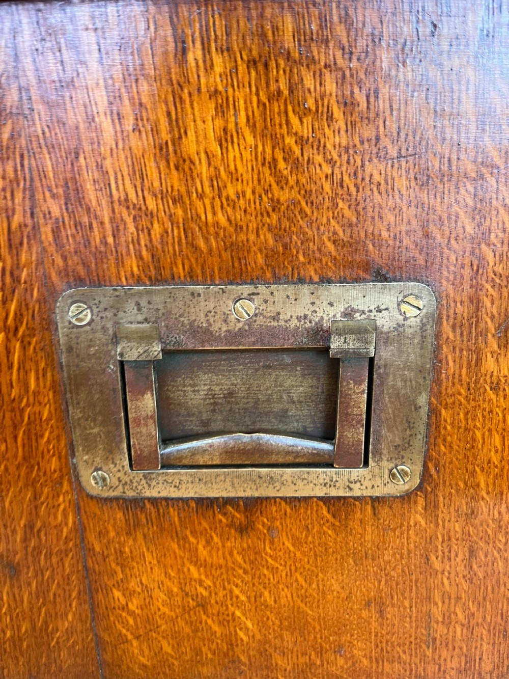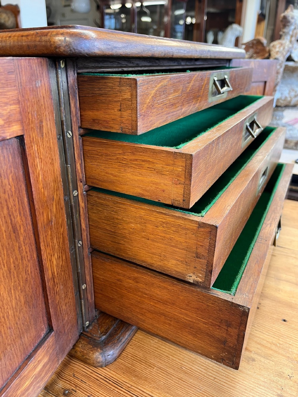Gefertigt aus massiver Eiche zeigt der Schrank eine warme Holzfarbe und eine schöne Maserung. Die vier Schubladen sind mit Messinggriffen versehen und im Inneren mit grünem Filz (Baize) ausgekleidet – ein typisches Detail, das an seine ursprüngliche Nutzung als Besteckschrank erinnert.