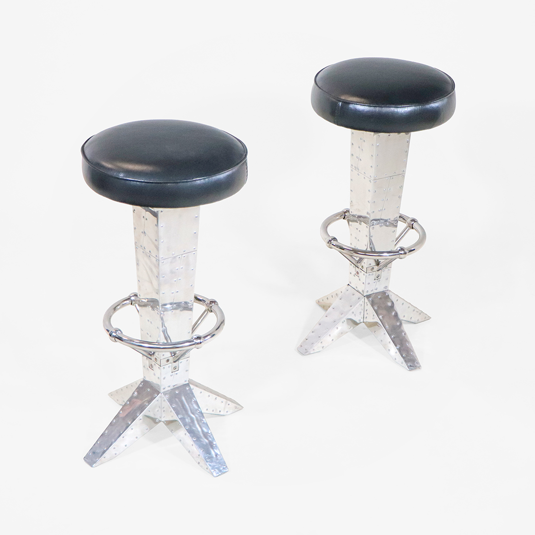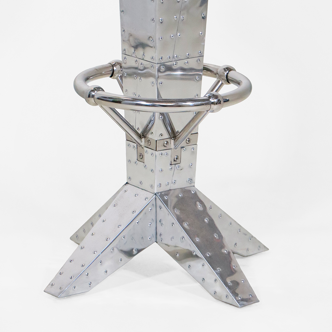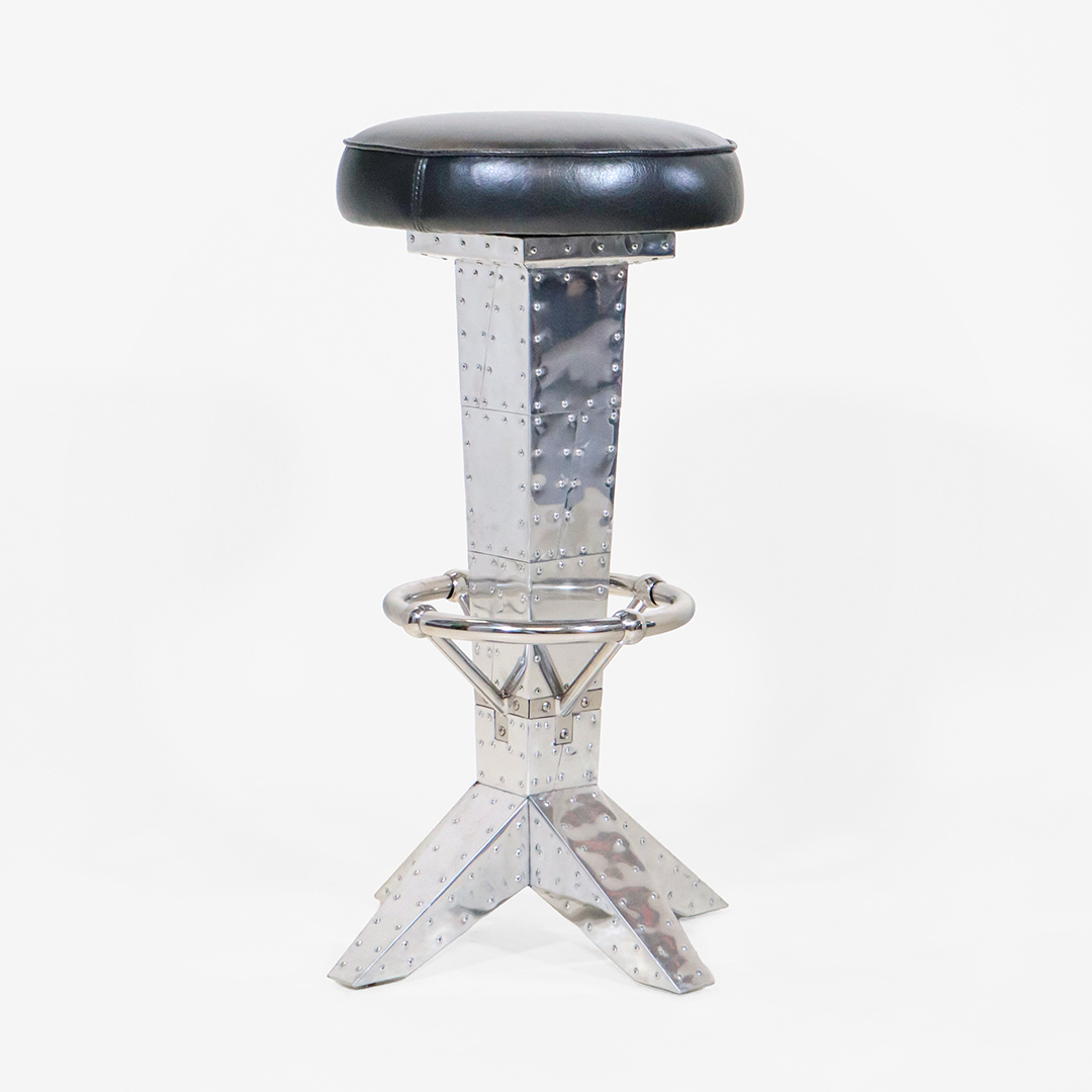 Dieser außergewöhnliche Art Deco Stil Barhocker verbindet markantes Industrie-Design mit klassischen Elementen der 1920er und 1930er Jahre. Der Hocker besteht aus glänzendem, genietetem Aluminium und erinnert mit seiner Konstruktion bewusst an historische Flugzeugrümpfe – ein typisches Merkmal des beliebten Flieger Designs.