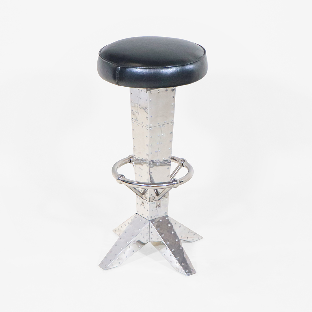 Charakteristisch für diesen Barhocker im Fliegerstil sind die zahlreichen sichtbaren Nieten, die das Aluminiumgehäuse strukturieren und dem Möbel seinen authentischen Aviation-Look verleihen. Diese Bauweise orientiert sich an klassischen Flugzeugkonstruktionen und macht den Hocker zu einem echten Blickfang.