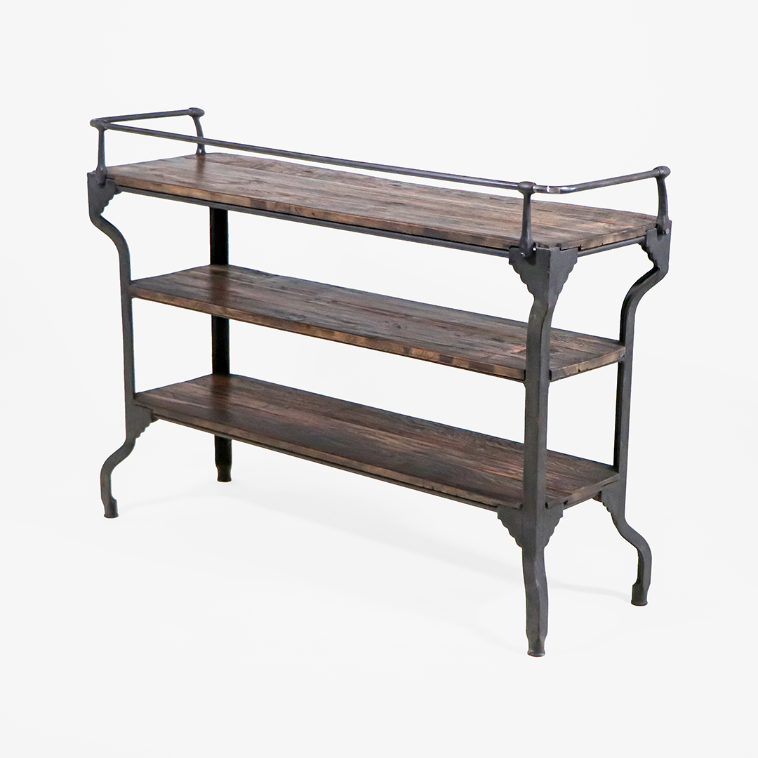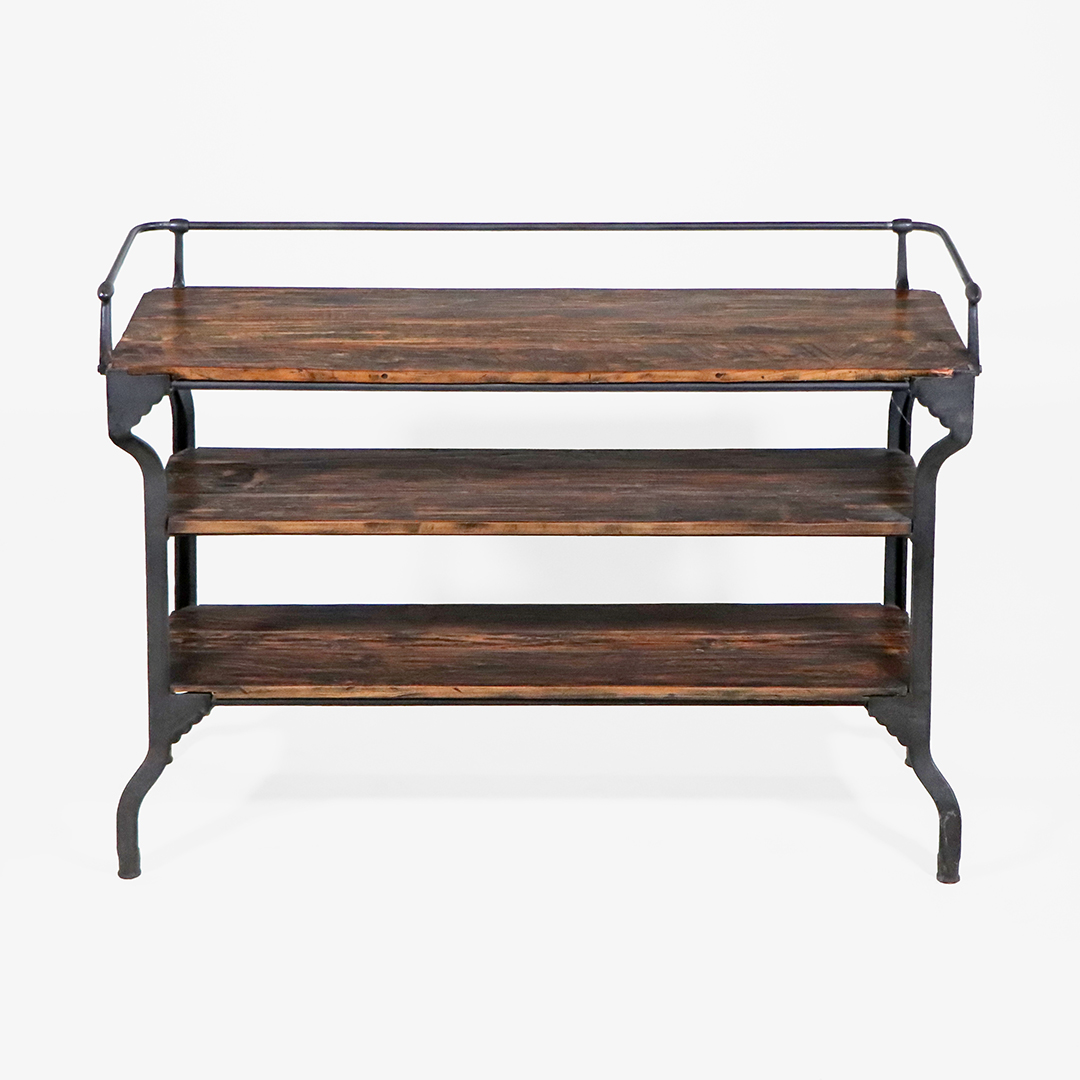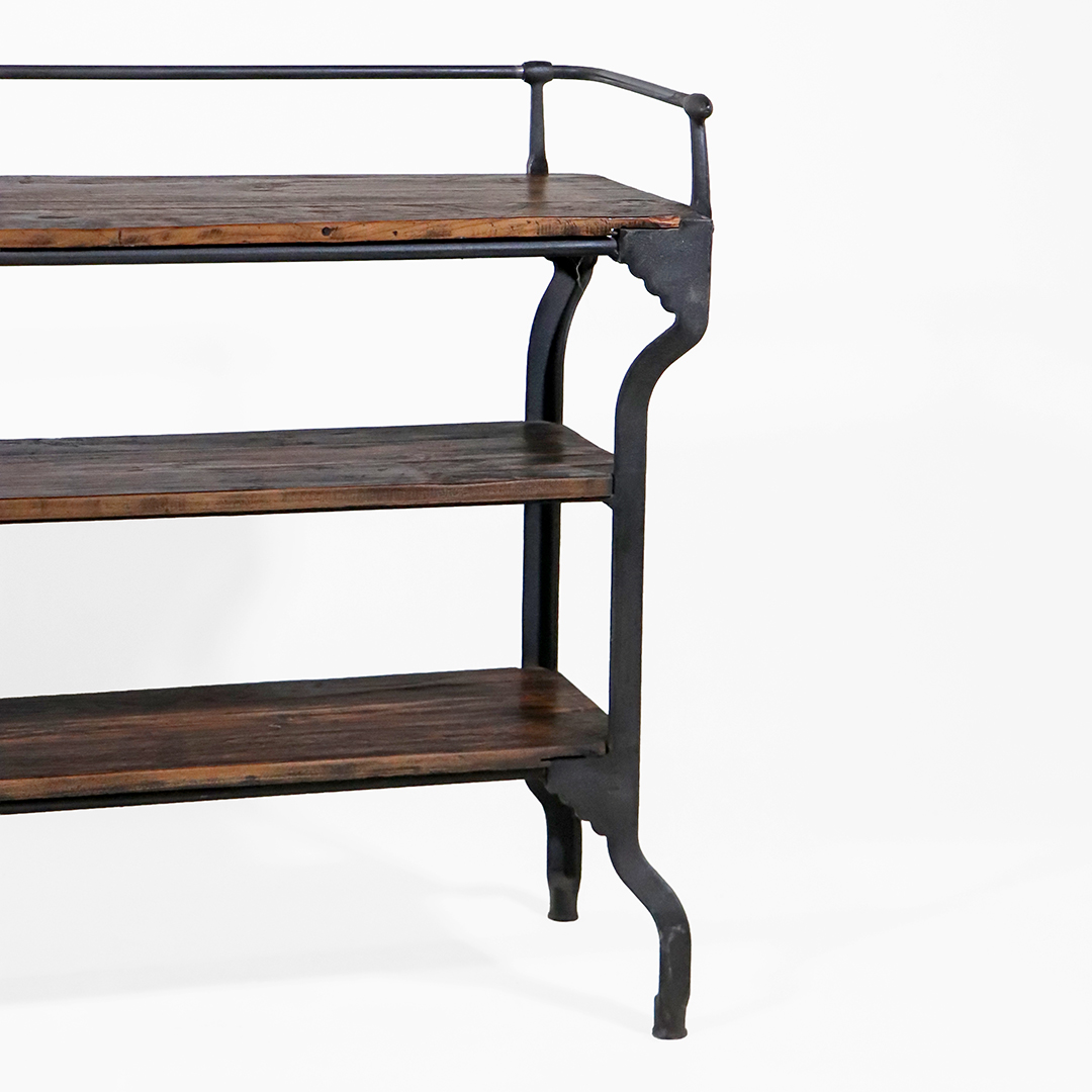 Die drei durchgehenden Holzablagen zeigen eine lebendige Maserung mit natürlichen Farbunterschieden. Die leicht rustikale Oberfläche unterstreicht den Vintage-Charakter und sorgt für eine warme Ausstrahlung.