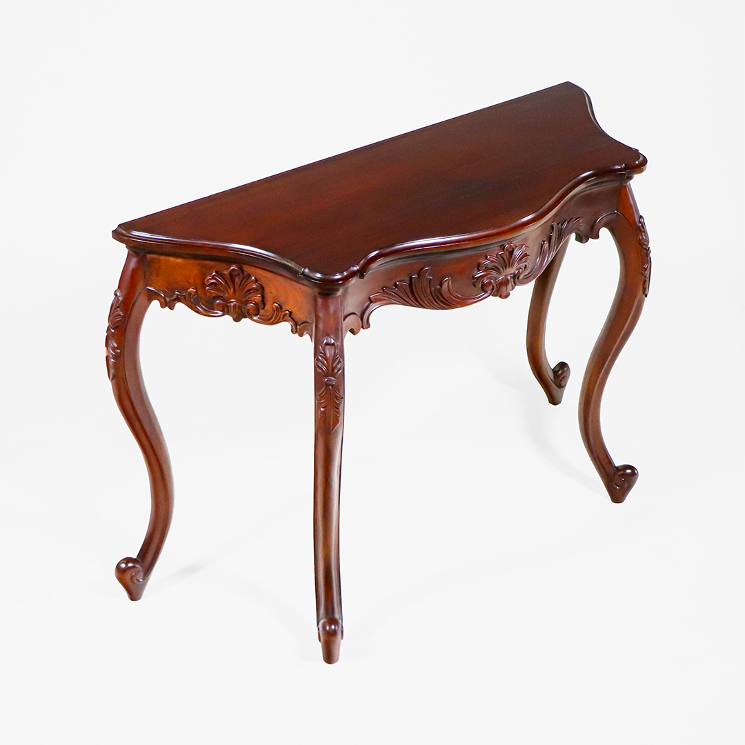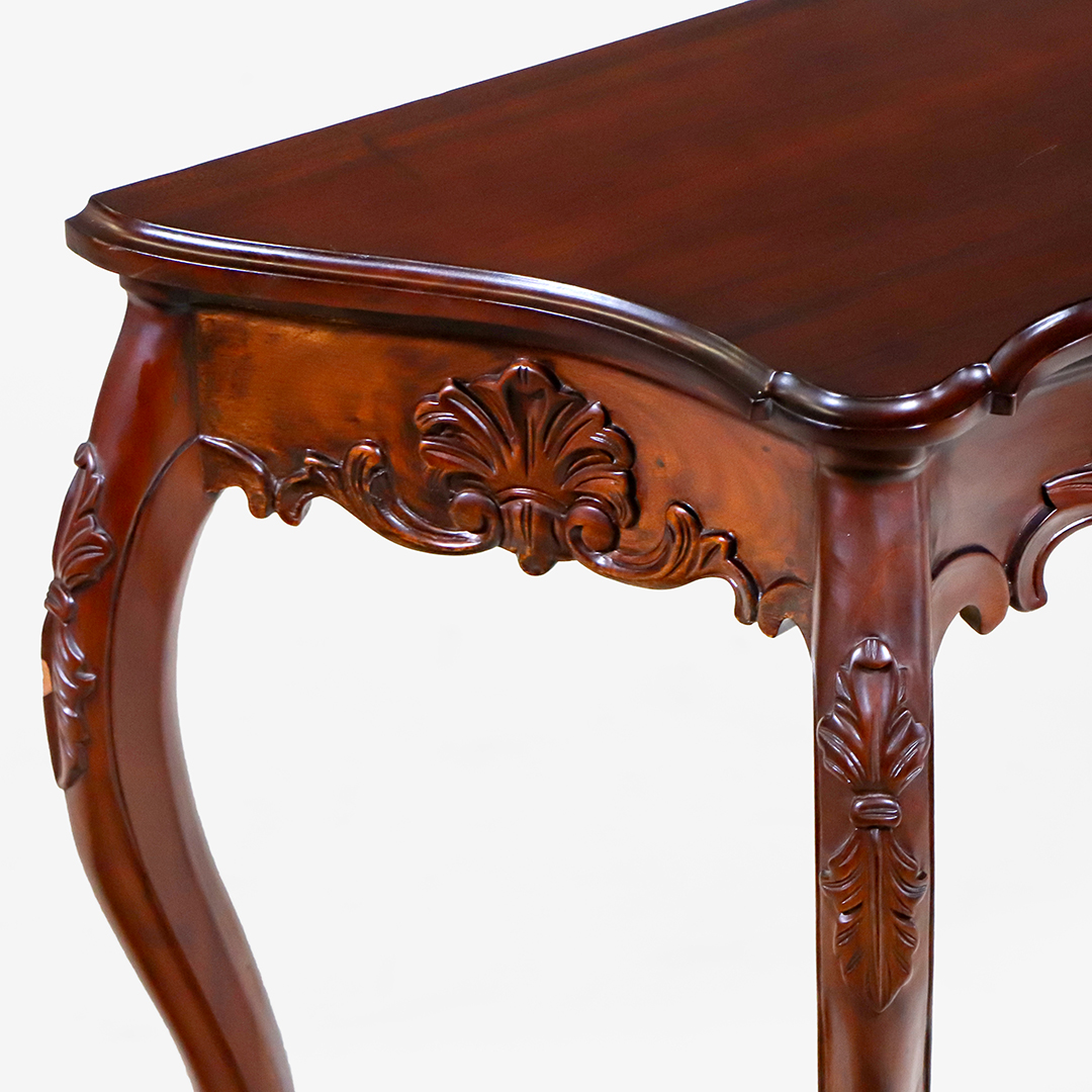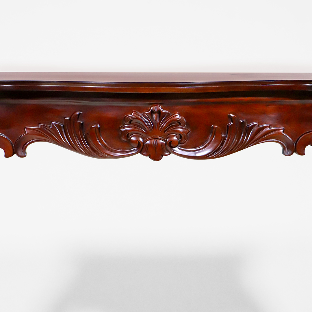 Dieser Konsolentisch bringt den typischen Charme französischer Rokoko-Möbel ins Heute, ohne Kompromisse bei Qualität oder Material. Gefertigt aus massivem Mahagoni und veredelt mit fein ausgearbeiteten Schnitzdetails, vereint das Stück klassische Eleganz mit moderner Stabilität. Obwohl neu produziert, orientiert sich die Formgebung klar an den fließenden Linien und Ornamenten des historischen Louis-XV Stils.