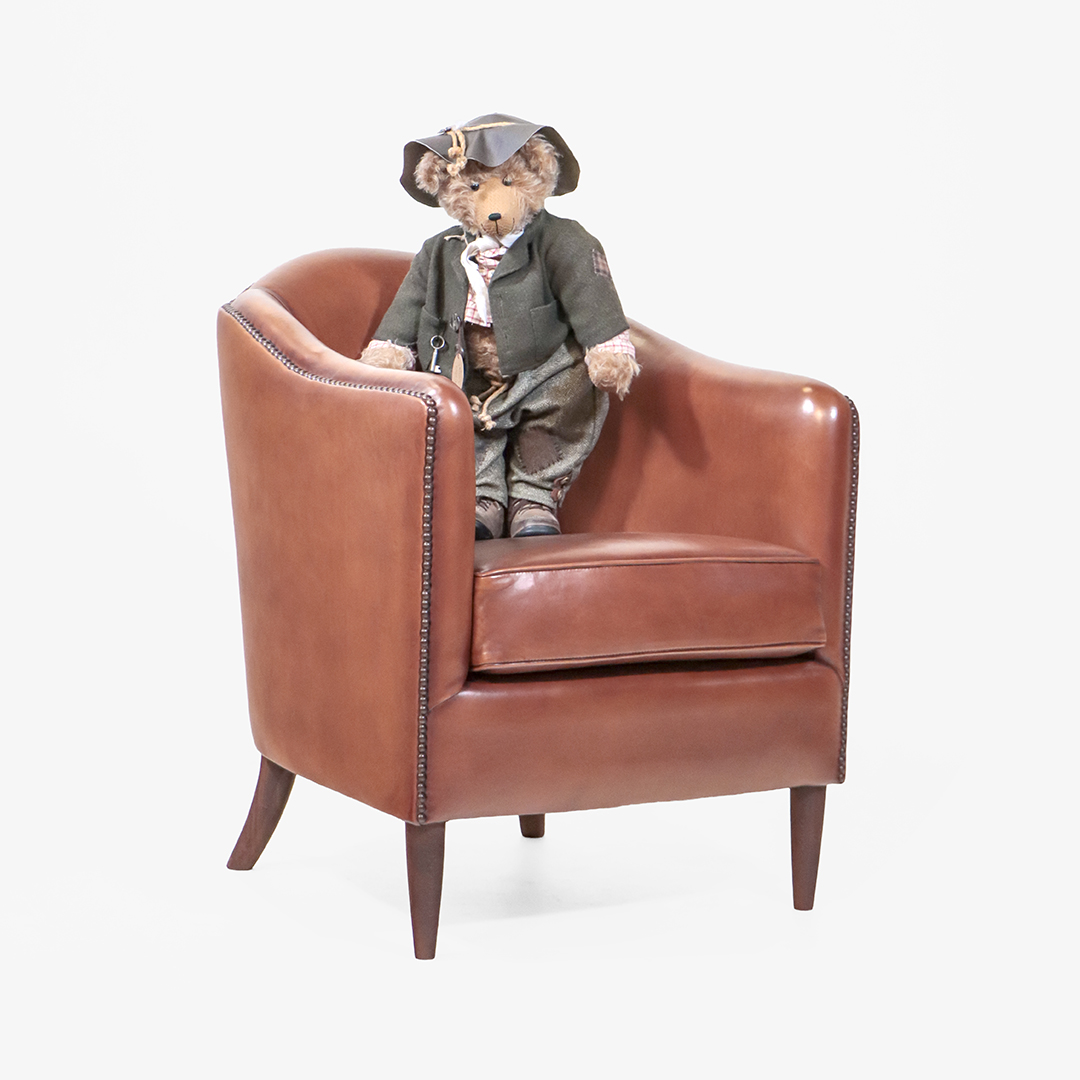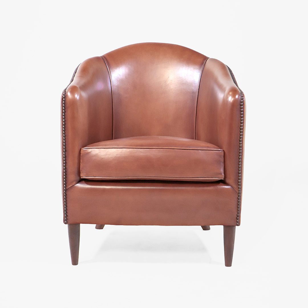 Der Art Deco Clubsessel „Portland“ steht für die elegante Formsprache des französischen Art Déco. Seine kompakte Silhouette, klare Linien und das hochwertig verarbeitete braune Schafsleder machen ihn zum idealen kleinen Ledersessel für stilvolle Wohnräume, Lounges oder Bars.