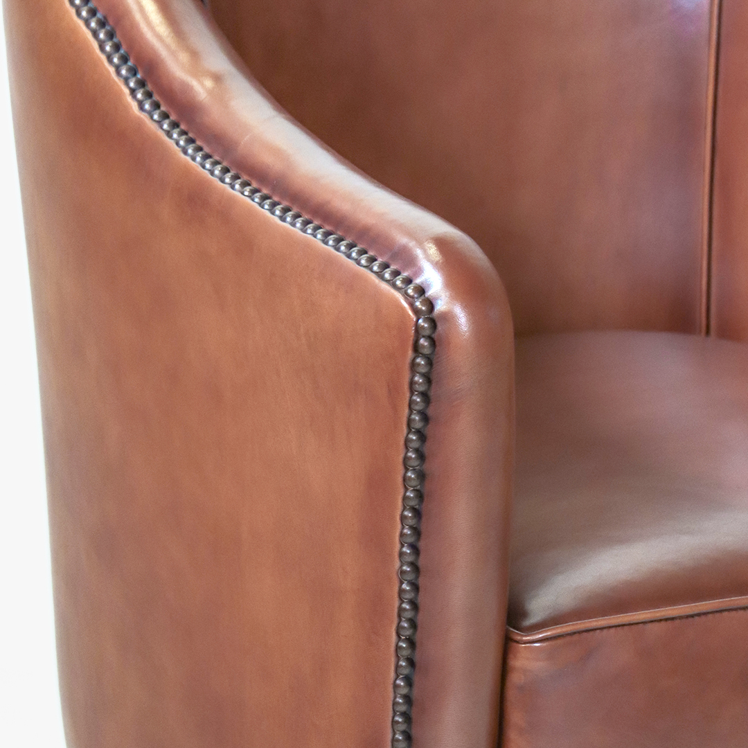 Das von Hand patinierte Schafsleder sorgt für eine warme, braune Farbgebung mit lebendiger Oberfläche. Jede Patina ist ein Unikat und unterstreicht den authentischen Charakter dieses klassischen Cocktailsessels.