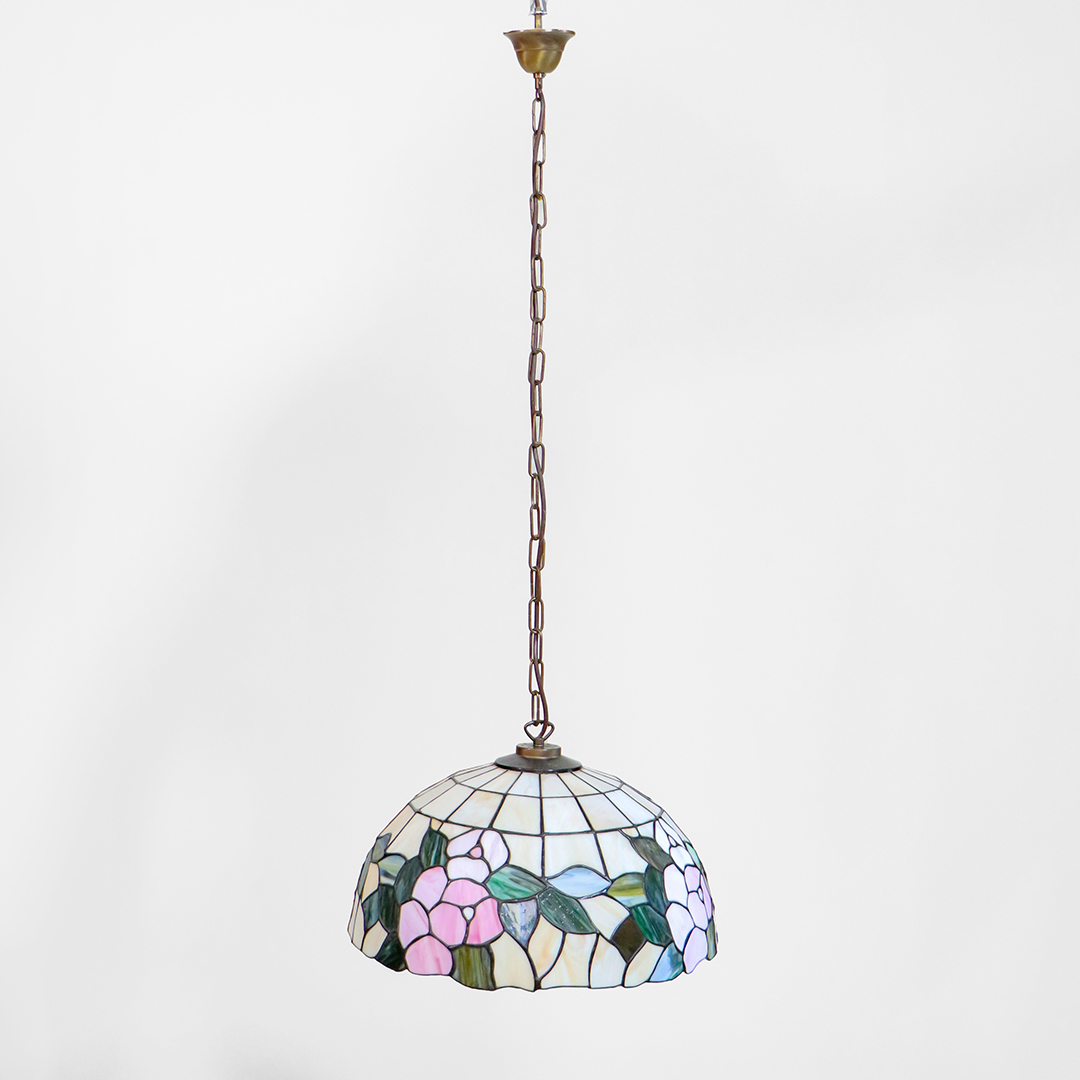 Diese dekorative Vintage Tiffany Deckenlampe besticht durch ihr markantes, großflächiges Blütenmotiv im Zentrum des Schirms. Die harmonische Farbgebung aus Rosa-, Creme- und Grüntönen sorgt für eine warme, wohnliche Ausstrahlung und macht die Leuchte zu einem echten Blickfang.
