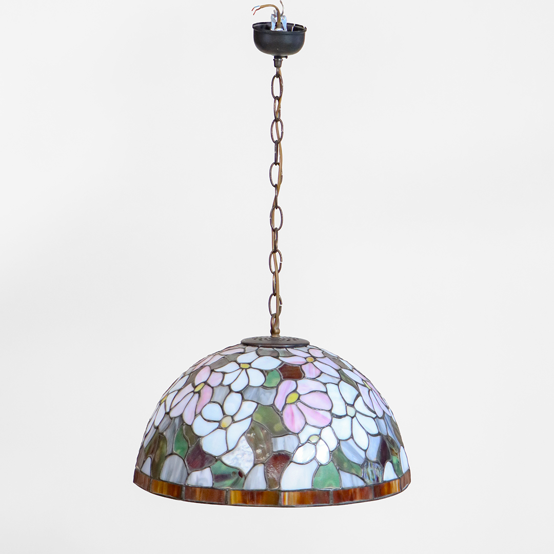 Diese hochwertige Vintage Tiffany Deckenlampe überzeugt mit einem kunstvoll gearbeiteten Schirm aus echtem Bleiglas. Das florale Muster in sanften Pastelltönen, kombiniert mit grünen und warmen Akzenten, verleiht der Leuchte eine elegante und zeitlose Ausstrahlung.