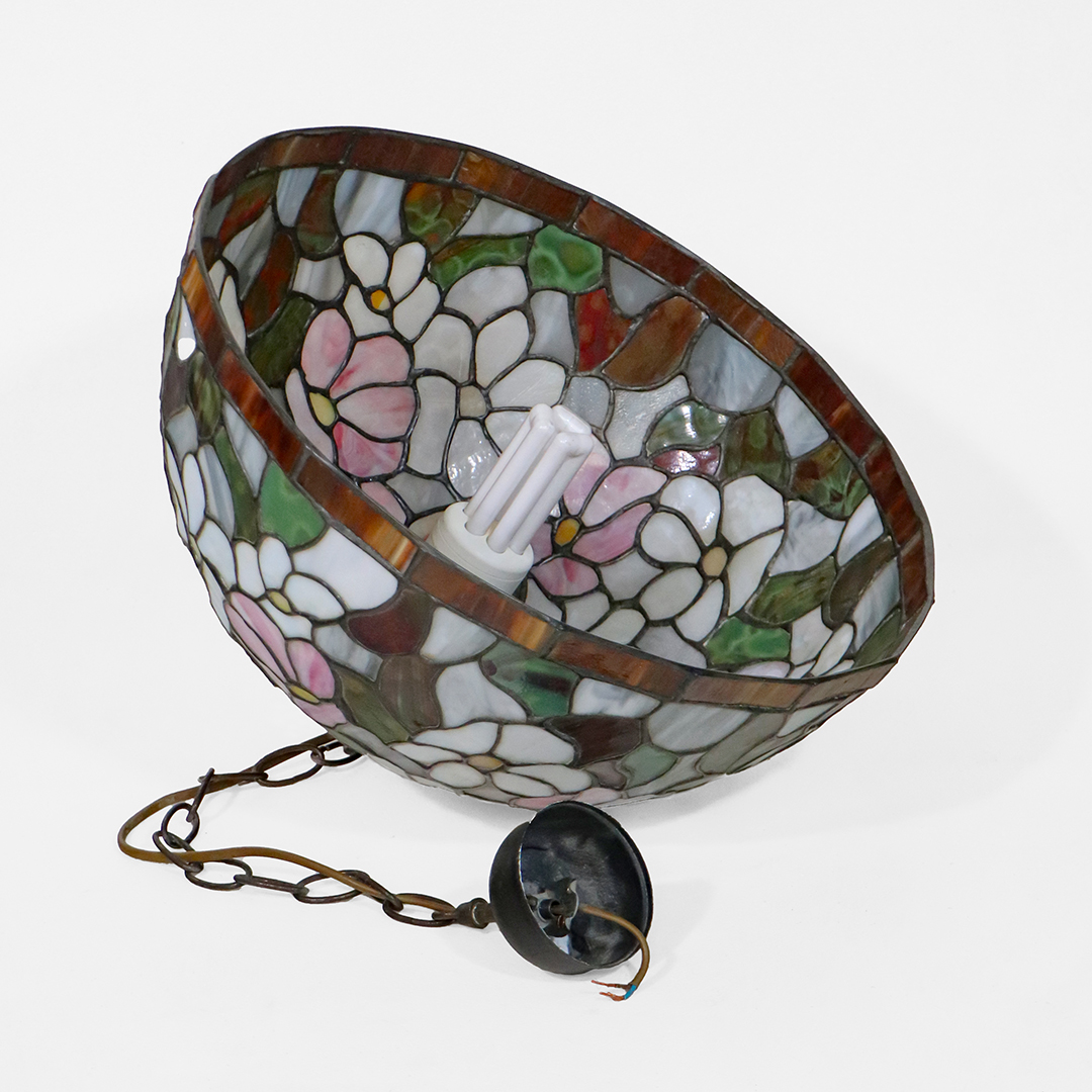 Vintage Tiffany Deckenlampe mit floralen Motiven – Bleiglas & Zinn, Ø 41 cm