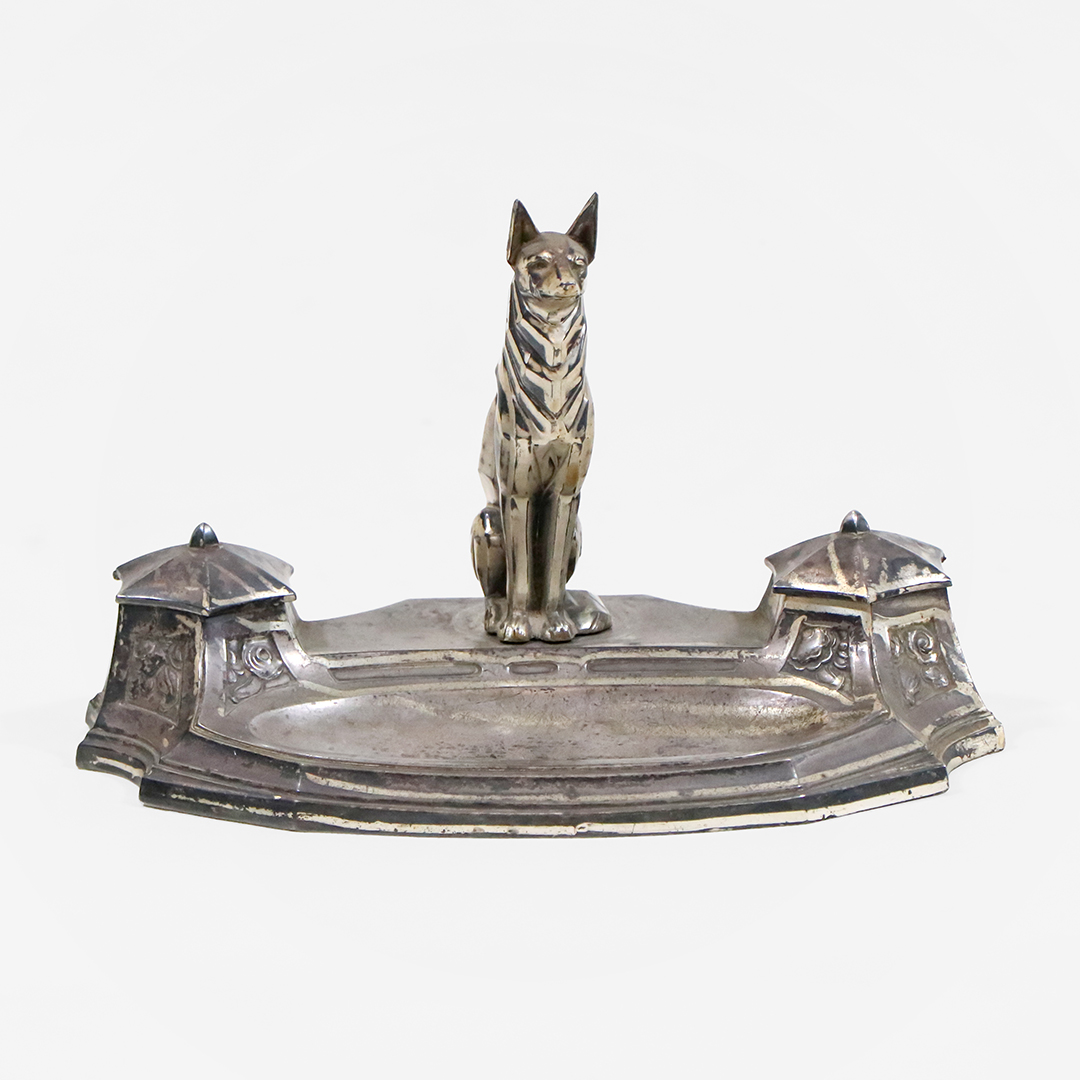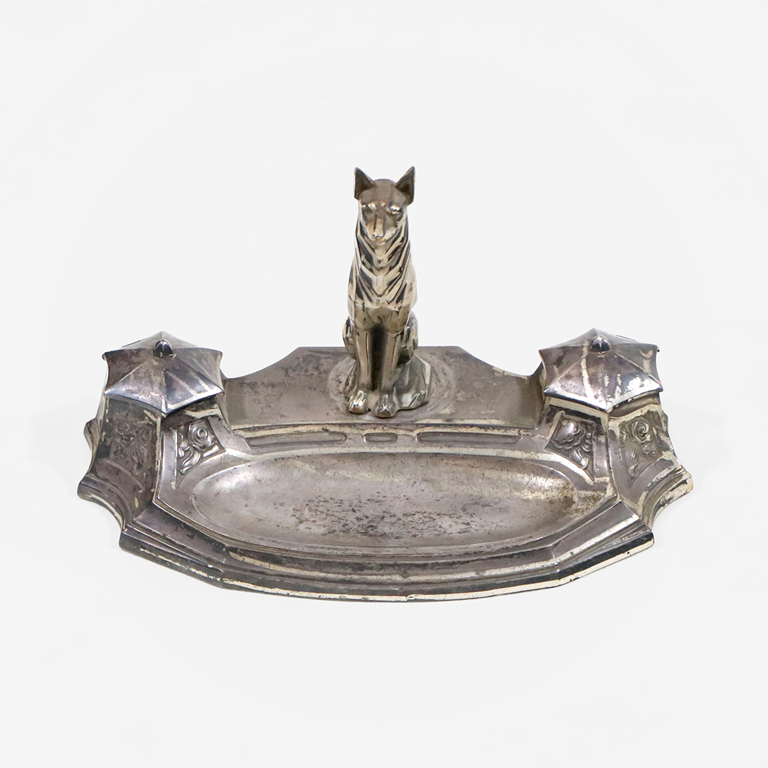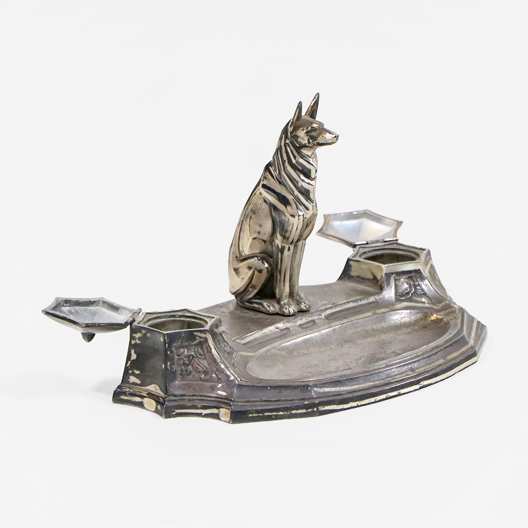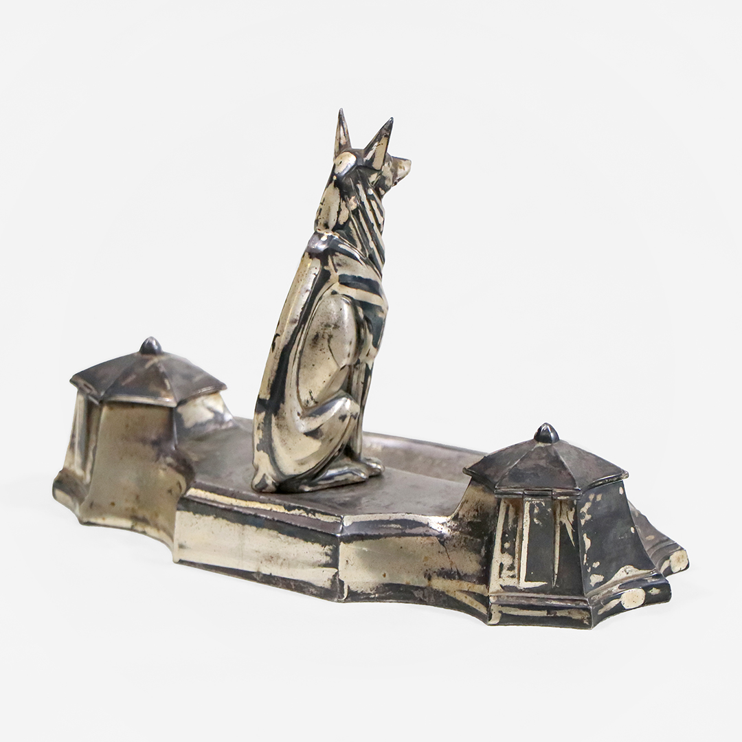 Art Déco Tintenfass mit Hund – französisches Schreibset aus Silber