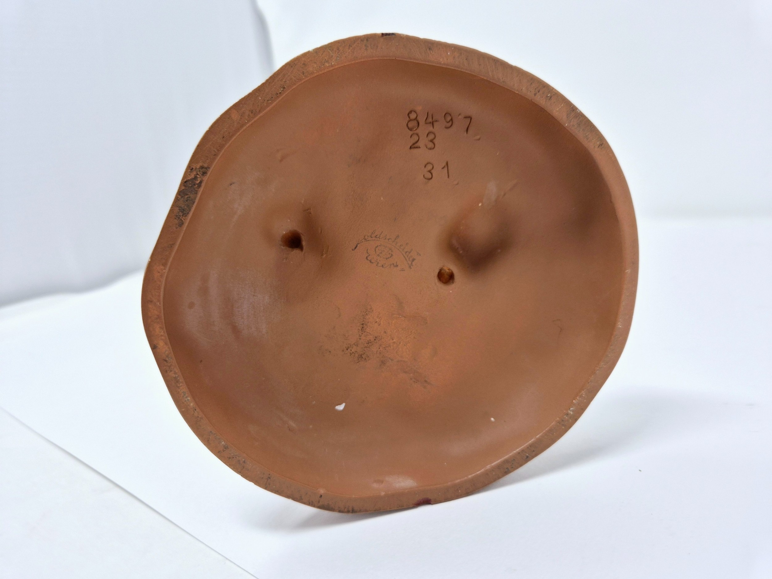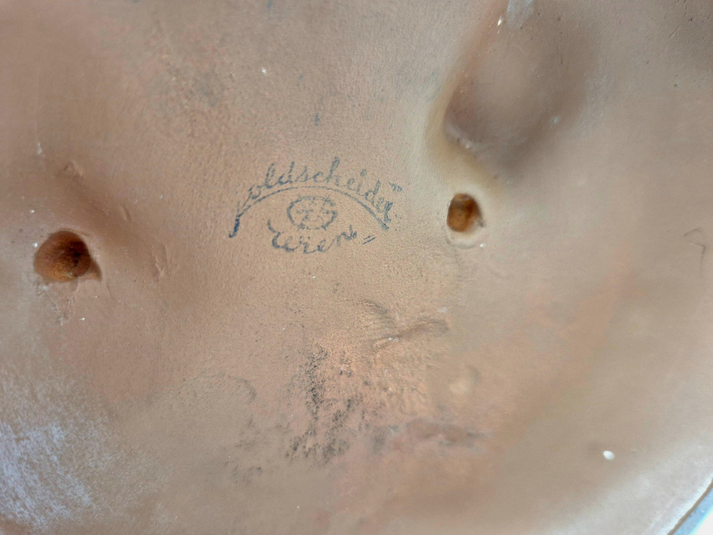 Die Terrakotta Figur befindet sich in einem hervorragenden Zustand – Nase, Finger und Zehen sind vollständig erhalten. Am Sockel ist sie mit Goldscheider Wien sowie der Nummer „8497 23 31“ gestempelt, was ihre Authentizität bestätigt.