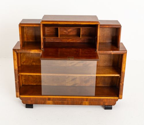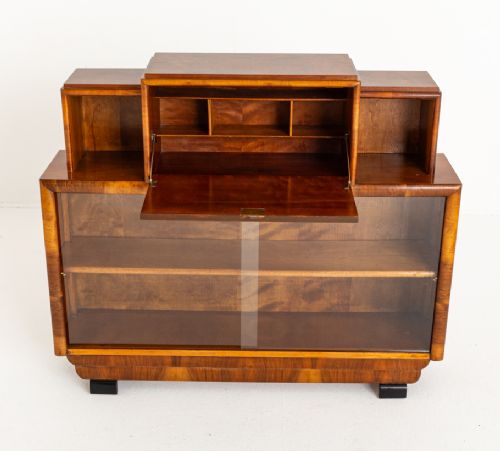 Art Deco Bar Vitrine mit Schiebetüren und Klappbar – Antiker Art Deco Vitrinenschrank mit Barfach – Art Deco Barschrank mit Glasvitrine aus Nussbaum