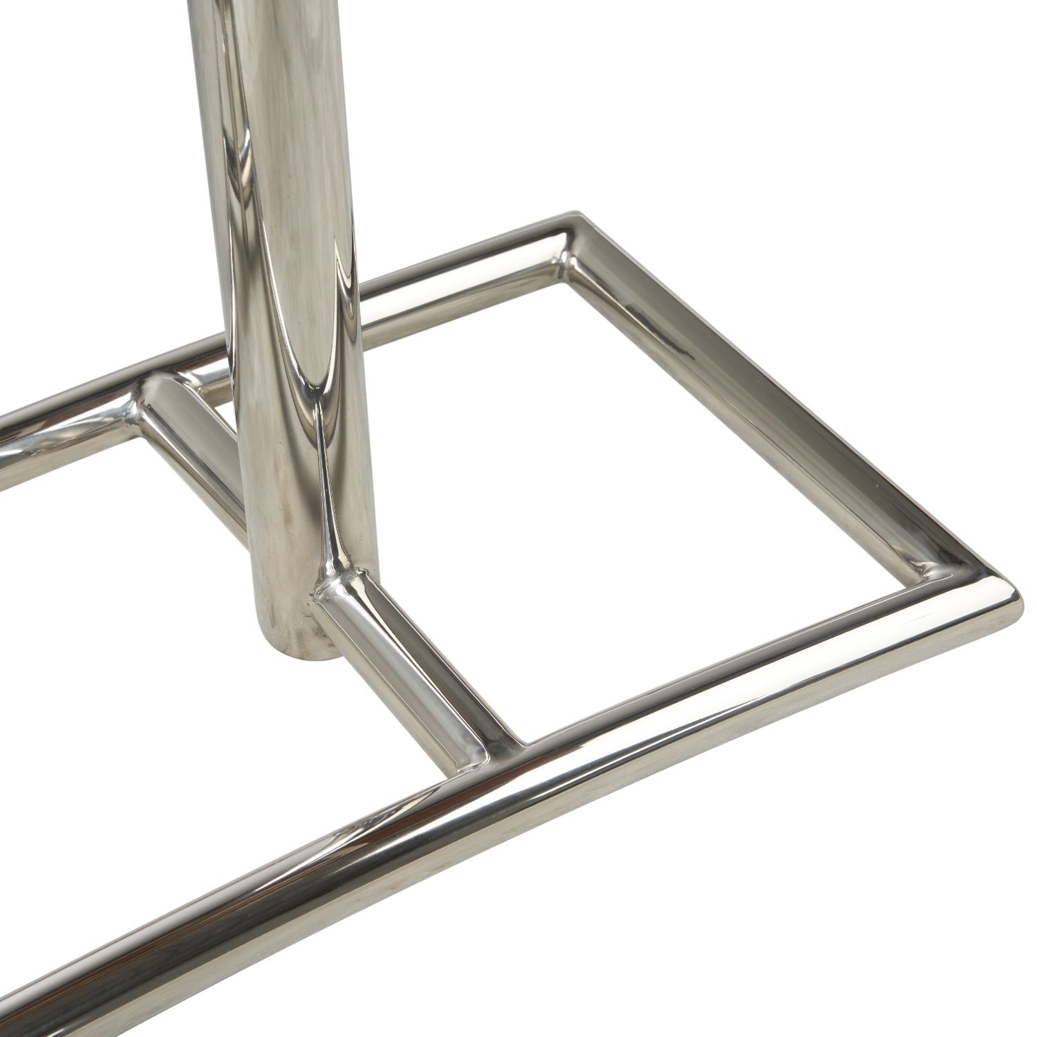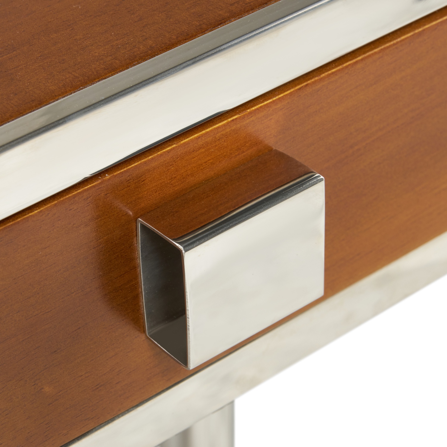 Das stabile Gestell aus gebürstetem Edelstahl verleiht dem Möbel eine leichte, moderne Optik. Gleichzeitig sorgt die solide Konstruktion für eine hohe Stabilität. Die Kombination aus Holz und Metall ist typisch für moderne Designmöbel und passt sowohl zu zeitgemäßen als auch zu klassischen Einrichtungen